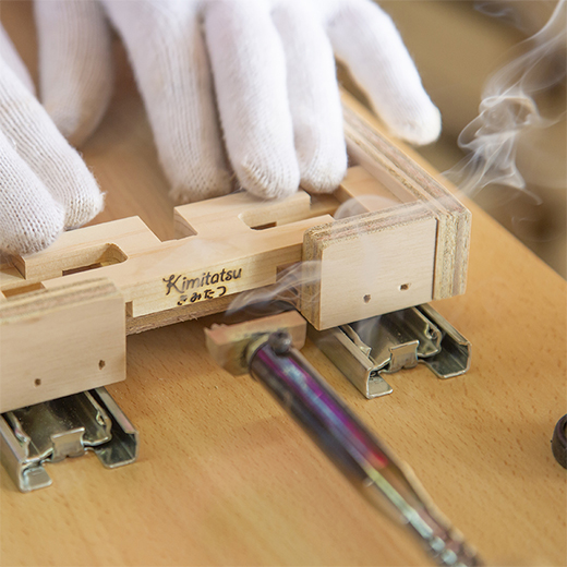 仕上がりの美しい留め加工、更に木ダボで箱を補強しており、安心してお使いいただけます
