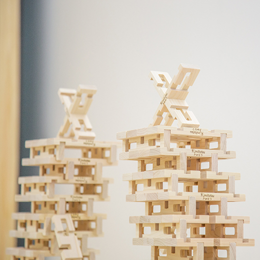 ただの積木でもない。組み合わせることで様々なカタチを作り出せるこの玩具の名前をどうしようか・・・と悩んでいたところ、保育園の先生からヒントをもらいます。「これ、柱の組み木みたいで面白いねぇ」なるほど。確かに「積む」遊びじゃなくて、「組む」遊びだと気付き、ヒントから出た日本の伝統工法でもある「組み木」をキーワードに、この玩具をクミキと命名しました。