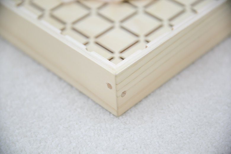枠は伝統的な留め加工を施し、強度と美しさを両立。枠を留めるために金物等は一切使用しない、木ダボで留める技法で仕上げています。