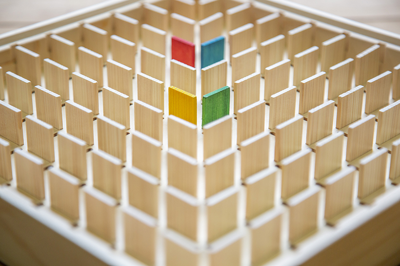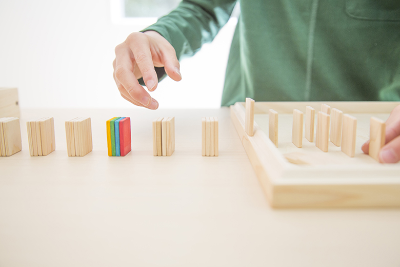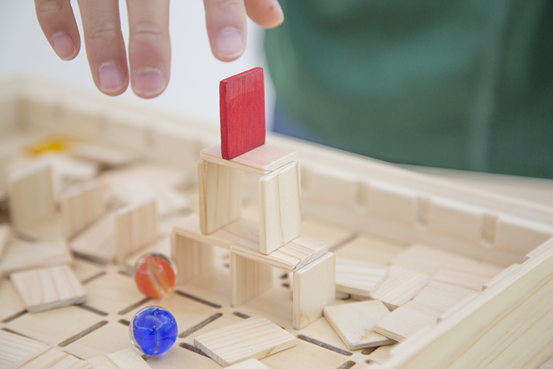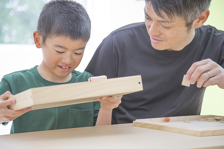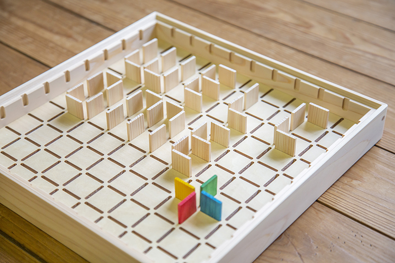 理由を聞くと「赤い板がスタートでな、青い板に玉を当てると緑の板に飛ぶねん。」と。なるほど、色に役割をもたせて自分でルールをつくっていたのです。これはコンセプトに合うと判断した弊社は早速仕切り板に赤・青・黃・緑の4色を1枚ずつセット。戦前から木製教材をつくってきた経験から、食紅での着色方法を選びました。